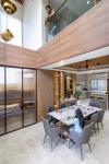 The dining space features a luxurious onyx Italian top with curved wooden legs and leather revolving chairs, opening to a semi-covered seating area and a serene waterbody. A wooden-finish suspended metal ceiling adds warmth to the dining and family sitting areas.