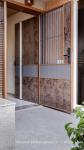 The main door features a raw, rustic charm with corten steel finish stonelam, grey mosaic, and a Corian handle. A floating console with PU-finished CNC-cut MDF adds uniqueness to the vestibule, complemented by beige chairs and a black glass center table. A serene ambiance is created by a Shree Radha Krishna 3D painting, stone veneer backdrop, and wooden fluted ceiling panels, offering a warm and welcoming entry.