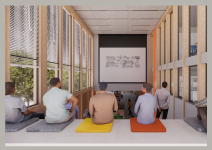 Open studio spaces encourage free and creative expression, allowing students to engage in individual and collaborative work. The inclusion of natural light in these spaces boosts mental performance, improves mood, and reduces the anxiety often associated with intensive academic projects.