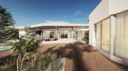 Small patios and zones of green space achieve the bright lighting, ventilation and cooling of the closed spaces, while an elongated covered ramp leads to the main entrance of the house, shaping its blind facade to the street.