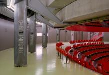 In order to optimise the number of spectator seats and the view, the upper seating levels, which are made of prefabricated concrete and form a ring around the stadium, are supported by metal consoles grafted onto the pillars.