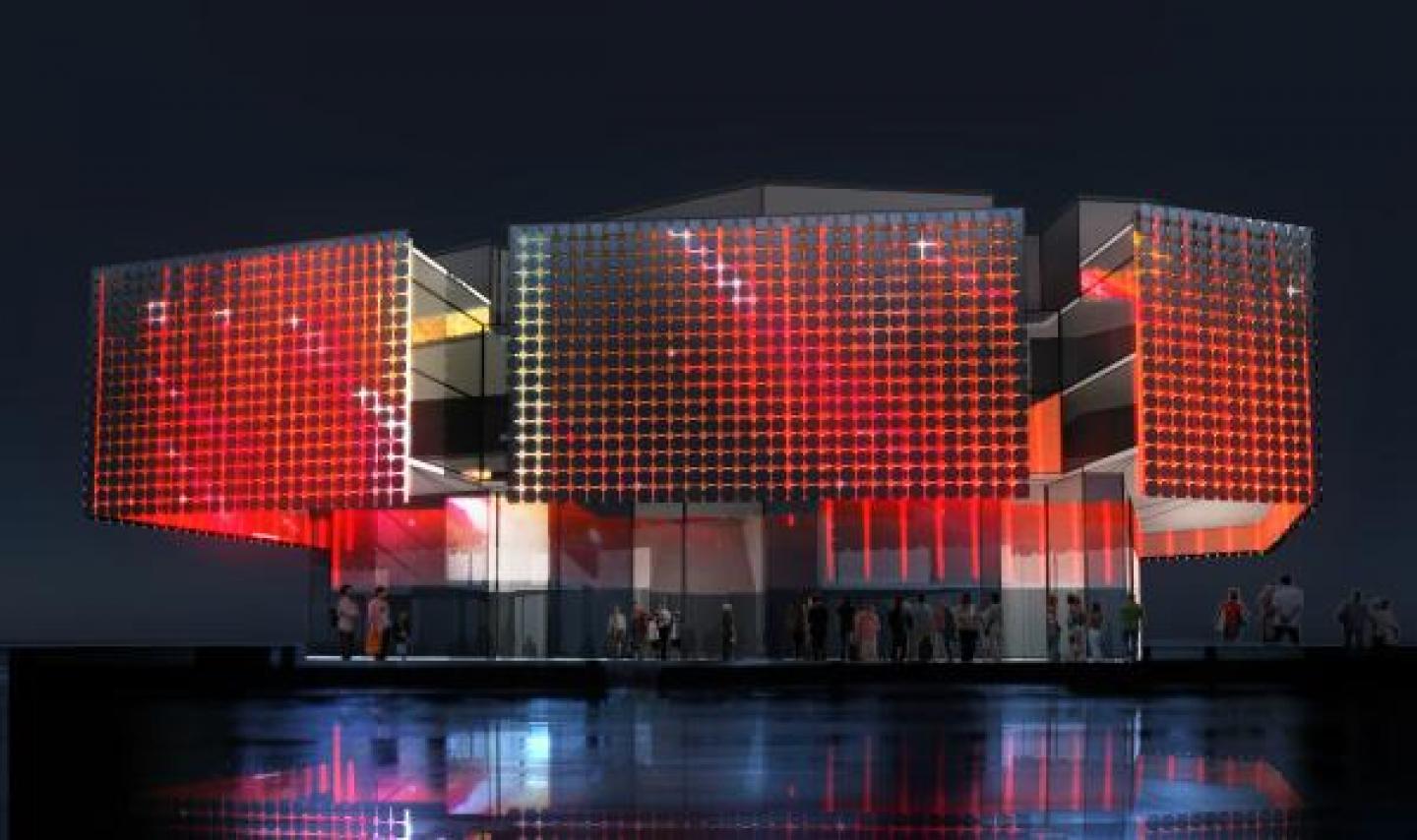 In a reference to the multiple screens – fascinating and iconic objects of our time – which will people the building, the outside walls are covered with a gilded skin that acts as a substrate to the aluminium discs that form an array of pixels. Behind the discs, the background is lit by diodes, which transform the image of the architecture at night. A computer program will vary the lighting and colour of the diodes, enveloping the building in a changing and communicating skin.