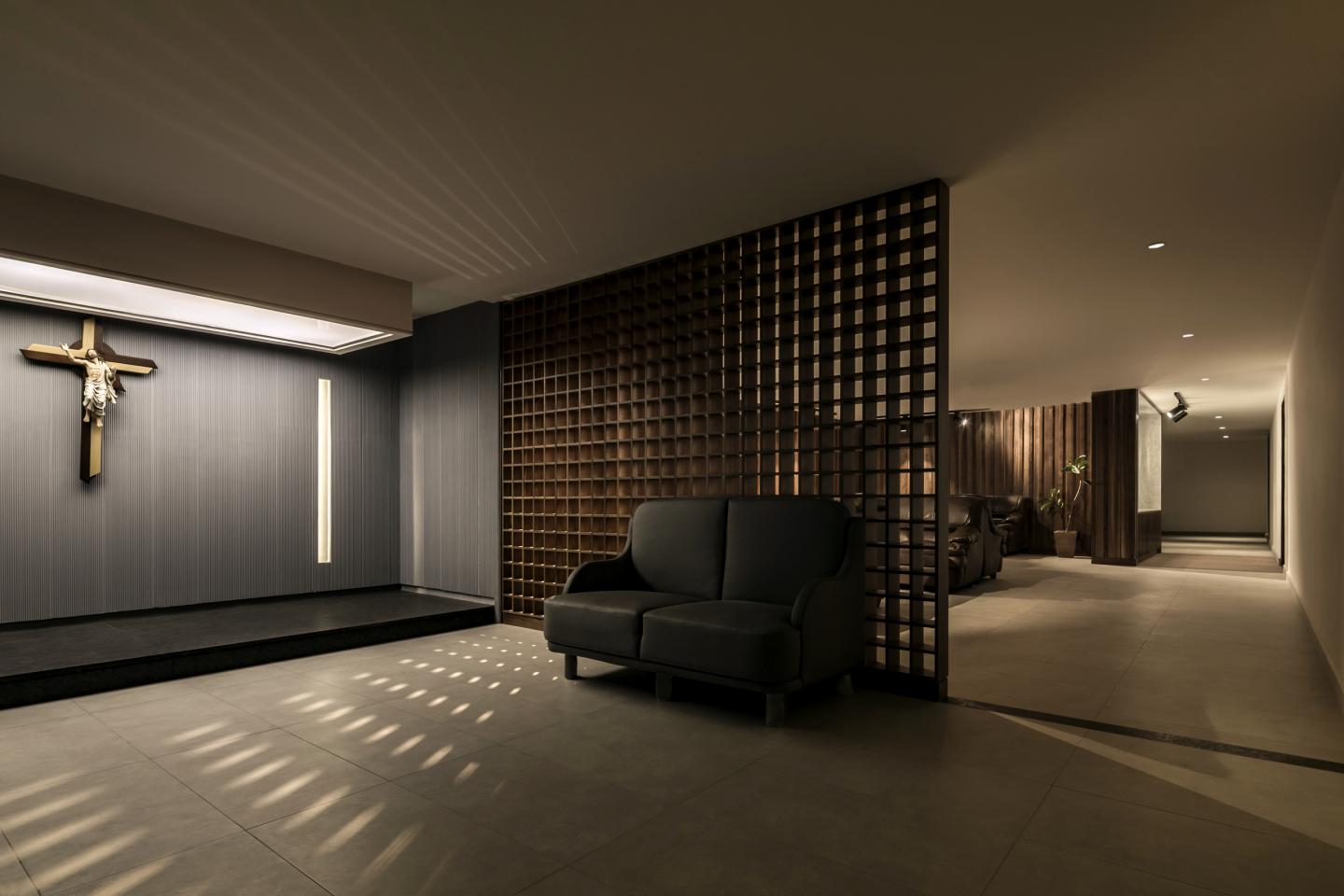 The commission involved creating a separate funeral chapel from the rest of the chapels in what used to be a parking lot. Therefore, it was decided to take advantage of the building's structure and create three significant moments. The altar is the focal point of the space, a farewell that speaks of the ascent of the spirit. The verticality of the details creates a perception of height. The space was conceived as a tribute to the mortal remains, subtly illuminated by zenithal light.