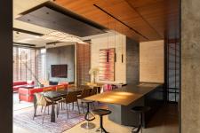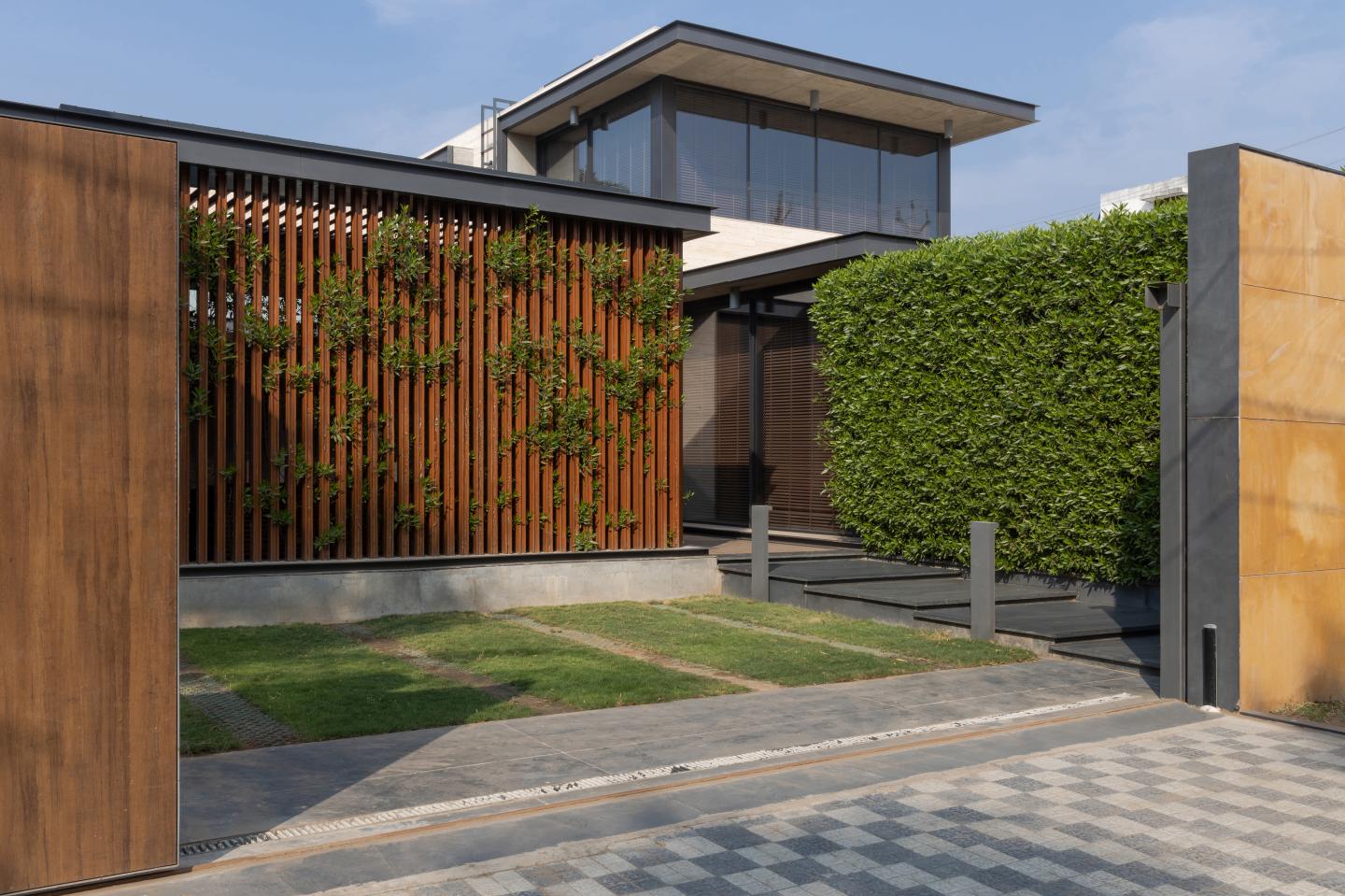 Exemplifying a modern aesthetic, the house sits as a sleek, elevated structure juxtaposed against a monolithic expression of travertine stone accentuated by subtle hints of concrete, metal, and wood detailed to perfection. Inspired by traditional Indian homes, the spatial layout centers around a semi-covered courtyard. Enclosed by family spaces and an adjoining lawn, this central courtyard acts as the heart of the abode. The upper level of the dwelling, showcases a captivating combination of glass, wood, and floating concrete canopies, adorned with metal accents along their edges, and is dedicated to private quarters that overlook the courtyard and pool. Abundant windows provide panoramic vistas that seamlessly connect the interior and exterior spaces. The compound wall, utilizing locally sourced stone as cladding and in gabion form, creates a sense of tranquillity and seclusion, shielding the abode from the clamour of the bustling street and creating a peaceful haven.
