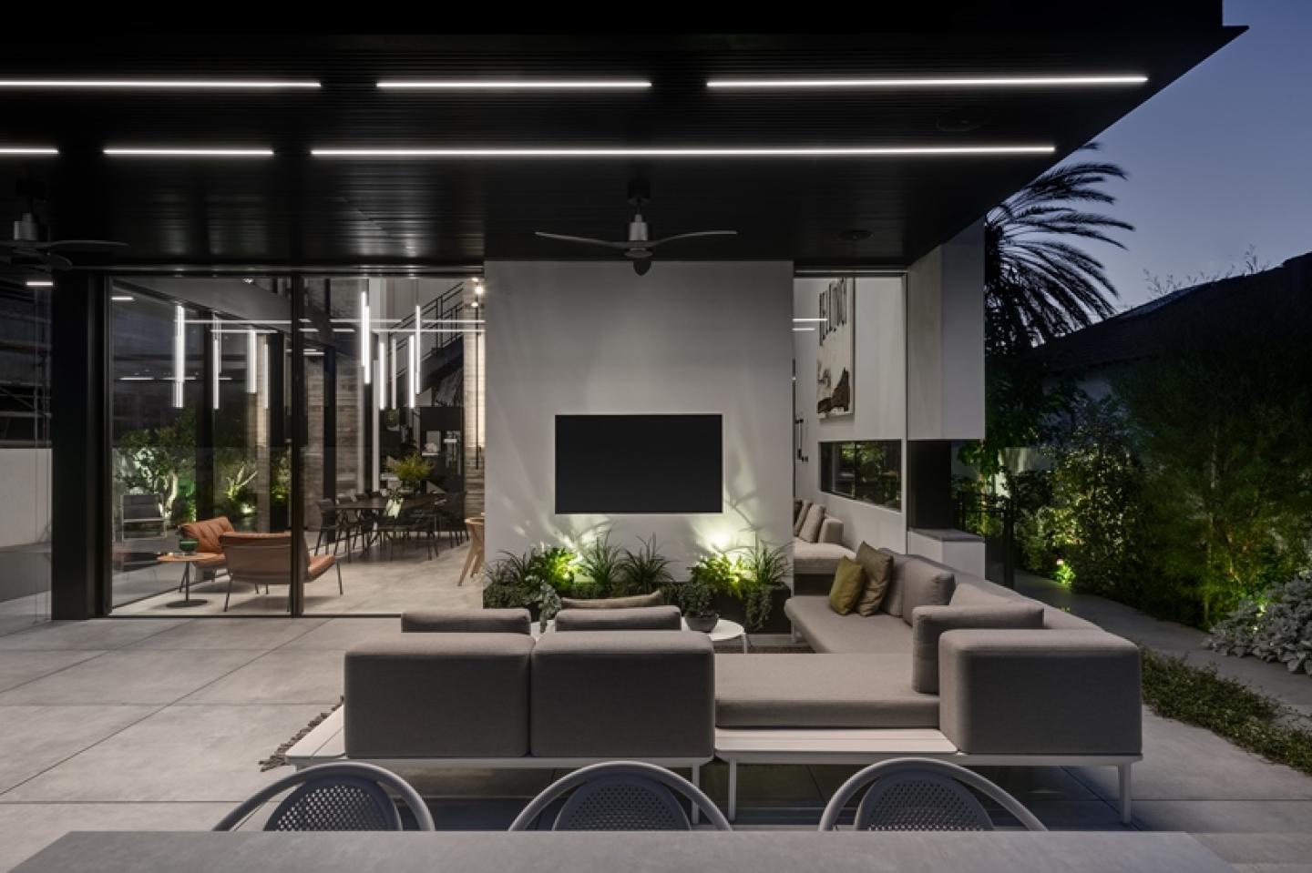"The swimming pool is adjacent to the indoor dining area and is felt throughout the entire floor. Within that, it's positioned in the optimal location in terms of light and sun exposure," explains Hadida. "For the outdoor entertaining area, I clad it in floating porcelain granite tiles, creating a continuous surface between the indoor living room and the infinity pool, whose surroundings are paved in blue stone. This is an area that serves as a focal point from which all the unique elements designed into the house can be seen, like the exposed concrete mass that penetrates inward and the horizontal window that begins in the outdoor living room area and continues inside along the wall of the indoor living room, so it's not always clear where, if at all, the boundaries between inside and outside lie. At the narrow end of the pool, there's a sunbathing deck with loungers, and at the long end, the water cascades cyclically to the lower level."