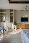 The master bedroom continues the soft palette through MCM Straw and veneer backdrop complimenting with dark beige leather finish headboards of the bed. Fabric texture wall paper in the ceiling tunes with the light beige back painted glass wardrobe shutters. A small office nook is highlighted with fluted relwood which runs all the way up to the ceiling.