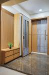The foyer of the apartment has an ambiance which is welcoming and giving a sense of warmth of the inside. The Main door adds a sense of raw look with a unique combination of grey color cement finish laminate in combination with fluted relwood. In the Grill door we have also provided MS grill with combination of fluted glass to get a semitransparent look through grill door. The vestibule of the apartment sets the tone and gives visitors a glimpse of the design aesthetic of the rest of the home. It continues the same design theme of the door featuring grey color cement finish laminate in combination with teakwood patti and fluted relwood along with sitting ledge that is functional and aesthetically pleasing.