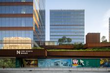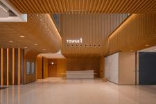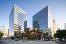The complex is comprised of two 14-storey office towers with 2 floors of retail-recreational activities, diagonally facing each other to optimise the view. The façade adopts glass panels to create distinctive office buildings from the surrounding urban fabric, and inject vitality into the interiors. Earth tone spandrel panels strengthen the connection with the podium.