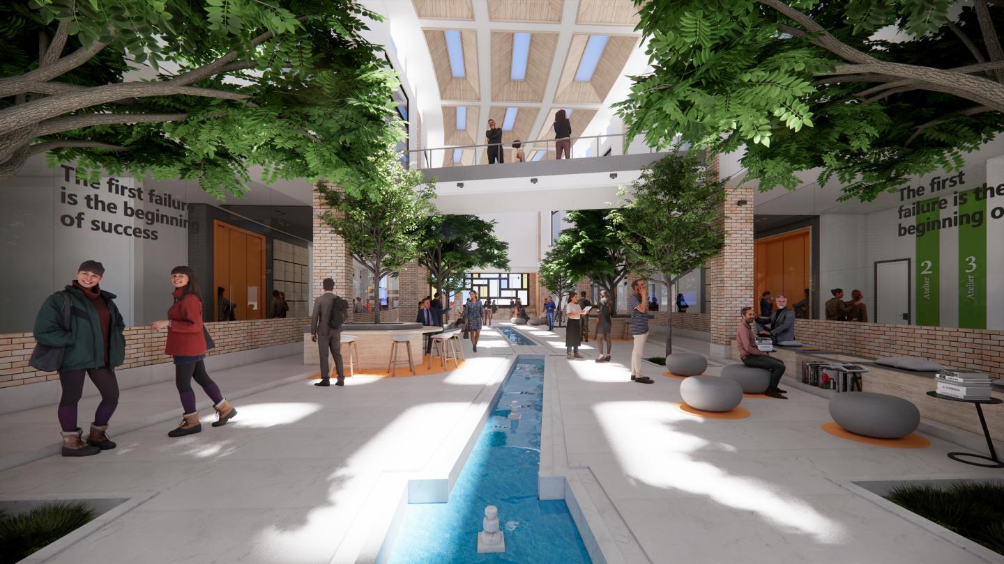 A space with rotating geometry and circular furniture that, combined with the green space, invites students to be more present and interact around group projects.