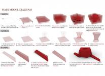The mass was placed in the middle of the empty spaces in the site so that it was equally distant from everywhere and not stay under the shadow of surrounded buildings. Two extensions directed to the dense areas at the ends of the field were added to the square mass. The mass is extruded 28 meters to get more sunlight and the extensions are turned into ramps with spaces under them with 4m of height at maximum to welcome people from both sides. In order not to interrupt the pedestrian transportation, the connection of the main mass with the ground floor was cut off for 4 meters. The floor was pushed down to prevent claustrophobic feeling on the ground floor of the building by not making the building any higher and disturb city’s skyline. Then the mass is rotated and an atrium putted in the middle of the square mass to get the best sunlight. Lastly, the facade covered the building to control the light entrance of the building and controlling the heat.