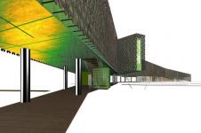 The building extends along an axis 160 metres long, perpendicular to the contour lines: it is situated "with the grain of the water". It is elevated so as not to create a break in the landscape. The extension to the reed bed around the building will emphasise this effect of a thing that has sprung from nature. The wetland is not interrupted and seems to run under the building, which is above, at the level of the canopy. The "underside" is a wide, roofed pontoon, which extends far out into the lake and contains all the accesses: public, staff, boat moorings, starting point for walks in the park and to reconstructions of Neolithic and mediaeval villages.