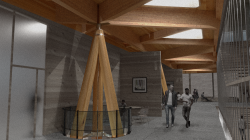 Designed as part of research to create an optimized balance between embodied carbon and operational carbon, the Roundtimber Eco-Duct is a structurally experimental welcome center for prospective Georgia Tech students. Designed as a research studio project into low embodied carbon structural systems, the structural system takes inspiration from a thesis by Dr. Aurimas Bukauskas of MIT, who gave consultation on the feasibility of the system. Expanding on the work done by Dr. Bukauskas, variations on roundtimber compound columns that geometrically solved the issue of racking, were the driving force of spatial layout as well as the overall structural grid design, and digitally fabricated roundtimber models give experimental credence to the hypothetical embodied carbon calculations.