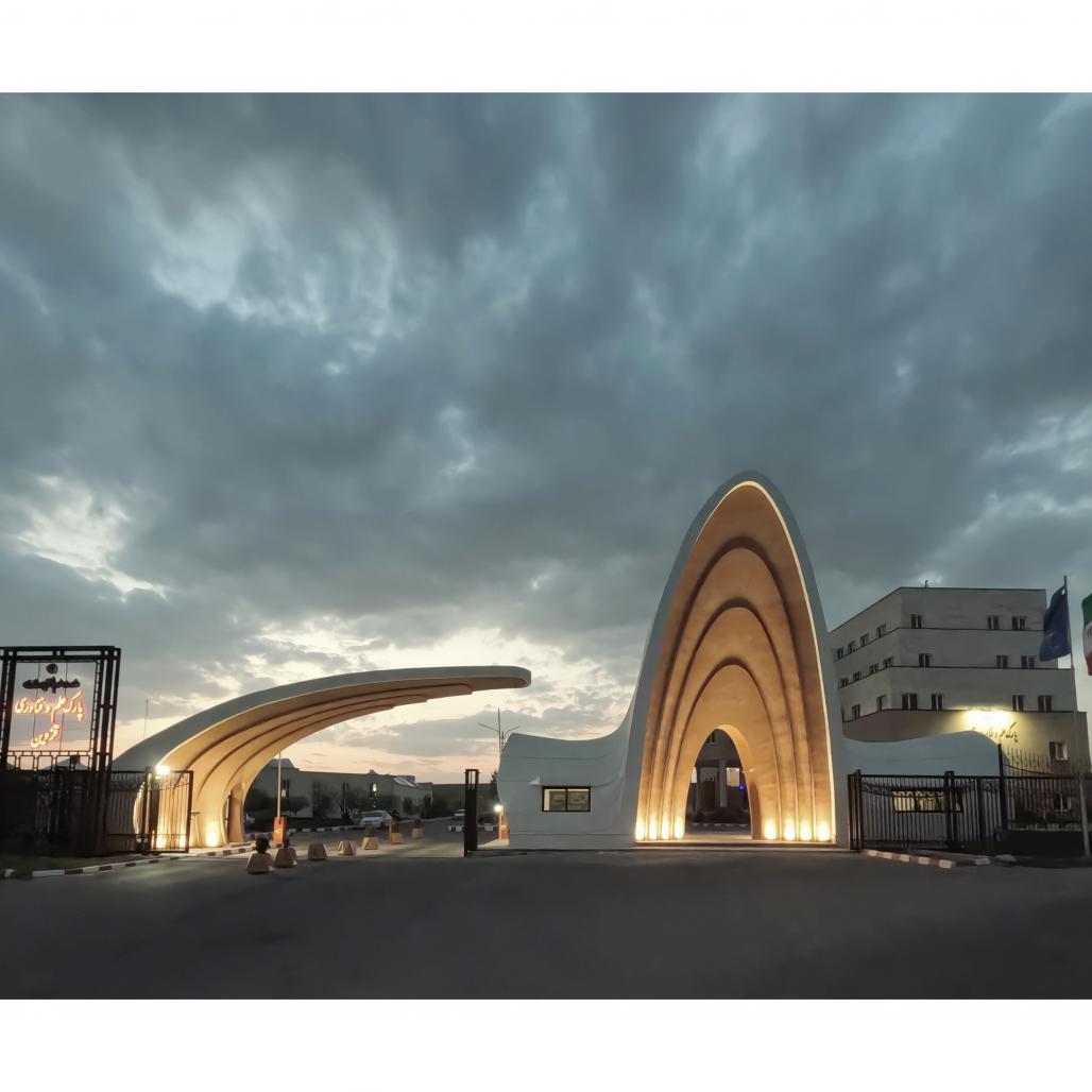 The entrance gate is inspired by the nature of the entrances in traditional Iranian architecture, which has been updated with a modern approach, in addition, since the use and activities of the complex are related to science and technology, the details and geometry of the arches are It is designed to evoke the path of electrons around the nucleus, especially when the dynamic lighting is activated at night.