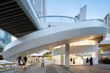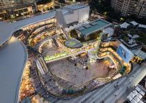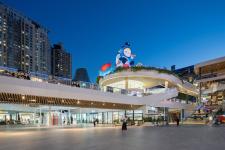 Apart from reserving the original circular form of the south-east corner, architectural forms of other corners are minimised. 4 retail entrances are featured with the new crystal shaped folding glass façade. The south-east façade also uses the folding curtain wall to enhance the vibrancy of the park, as well as to create uniqueness by designing a fluid canopy with large screens and lighting effects.