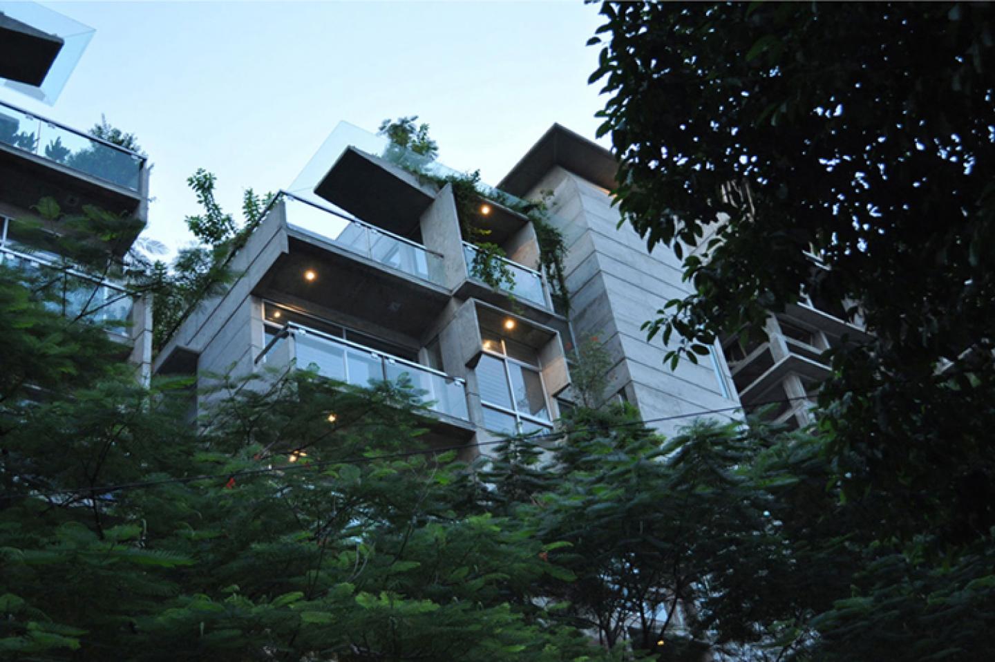 The two buildings developed were almost identical in terms of the ground floor plans and parking area and the basic plan of five apartments per building. The simple interior required some functional arrangements that connected the beautiful lake and large trees on the west, allowing the south east summer breeze to flow through the entire house with ample light round the day. The sunlight coming from the east also reflected on the trees as they grew up spreading its light branches transforming the building into a vertical garden.
