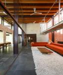 The house does not have a conventional cooling system. It is cooled by a combination of elements. Traditional ceiling fans. Shaded roof windows and a hallway rising up three storeys, draw hot air out using the stack effect principle. Large plane trees in the internal garden and correct building orientation, give shade. The water from the fish ponds and pool that cover the 65% of the internal garden area, evaporates providing additional cooling.