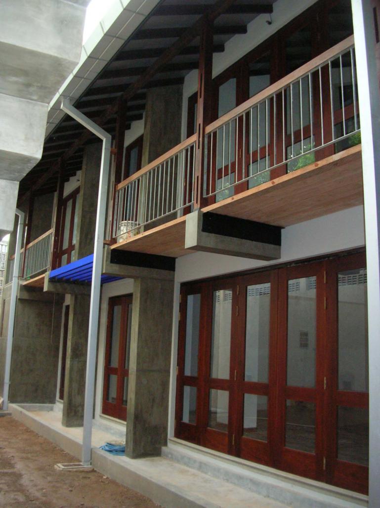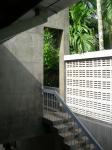 House in a Colombo sub urb for a child heart surgeon and his doctor wife where they planned to spend there rare free time in quite solitude in an increasingly private, well protected simple contemporary house. Clients wanted to relax at there home in there own private world, resulting in the high boundry walled gardens and private pergola protected bedroom courtyards in the house. House was mono pitch roofed overlooking a garden running the length of the house protected by high boundary walls out of cement louvered block work walls. Exterior of the house was painted totaly in greyish green cementitious paint to merge and blend with the greenery in the protected garden.