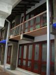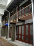 Mono Pitched corrugated cement board roofed brick masonary walled titanium cement floored timber decked balconies with hot dipped galvanized steel upright steel handrailings incorparated two bedroomed simple contemporary styled house overlooking internal garden running the length of the house