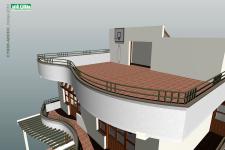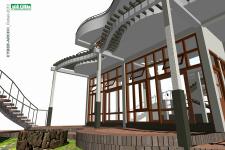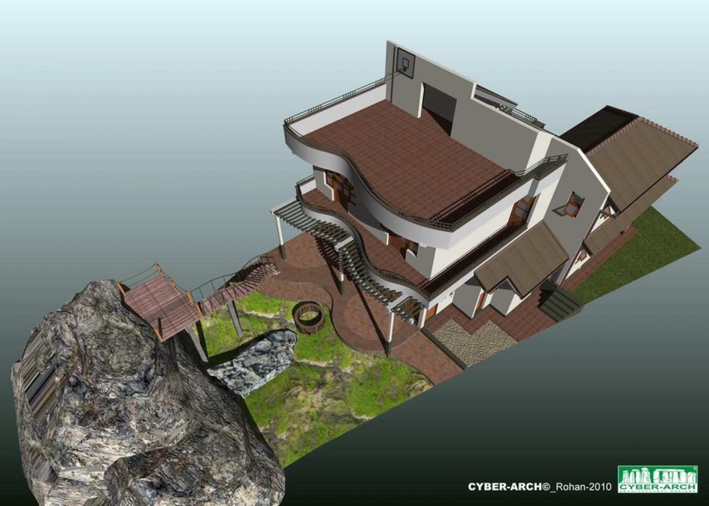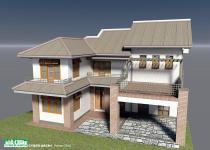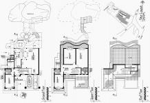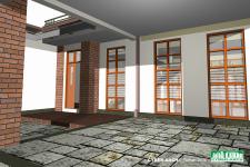 Weathered hard materials were used in paving and facings. Such as timber sleepers, weathered granite rock slabs, bare bricks in columns and terraces. Long irregular Shadows of back yard trees, casting on living area floor and walls through extra high back windows in evening by setting sun. Dense branches of trees should prune and train to allow the sun light.
