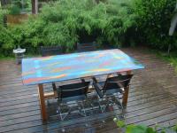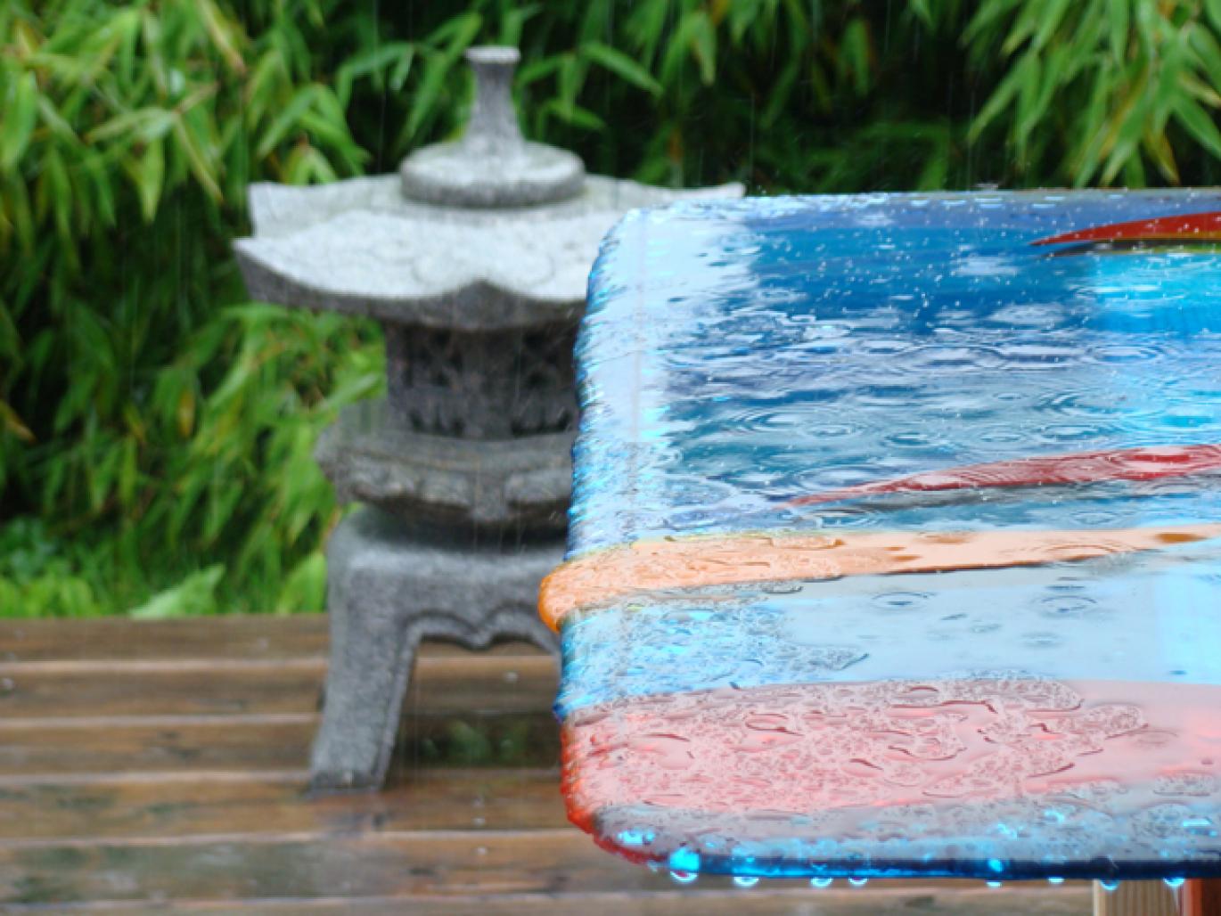 Glass table fussing technology Bullseye glass format 1x2 m with wooden under construction Out door collection