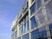 The sturdy building was conceived as a rectangular concrete block in a strict grid pattern contrasted by a free form shape of wire mesh. The grid pattern then filled with window frames over the longitudinal direction of the building facing the adjacent square on one side and the street on the other. The image presented by the elevations on the cross direction with their brickwork infill reflects the areas nineteenth century roots. And at the top, deflecting and refracting the sunlight, the wire mesh draped around the tough concrete edges and corners like a veil.