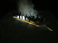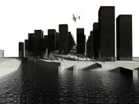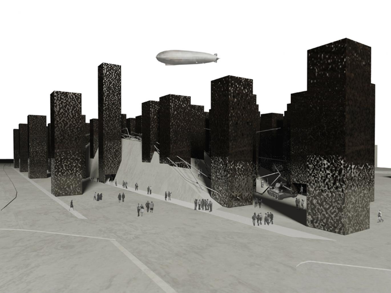 Material - repousse metal, related with the clang of metal of military technology. Metal plates are attached in spot manner so that they could move because of the wind blow and would send the sounds of the clang of metal. Like leaves of trees murmur and rustle in the forest, here the metal is clanged likewise. Indispensable part to the conception of the project – smoke, together with light and mournful smell floating from vertical elements create the mood of the burning forest or chimneys of crematorium, where light associates with manes of fascism victims. By these means it is tried to create lurid, intimidating mood, conceptually reflecting and reminding future generations of cruelties and harrying nature of the most global war.