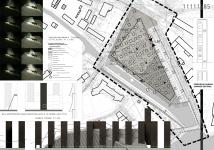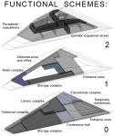 Vertical elements are used for the lighting of working premises, evacuation from the building, at the top of some elements the observation sites are installed where the museum, its territory, the old town of Gdansk, rivers and mountains can be seen. The height of vertical elements – 25 m. The main entrance is emphasized by upper vertical element (35 m). Vertical elements that are in the above-ground parking place are used for automatic multistoreyed car park ( 10X15).