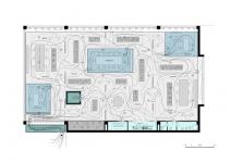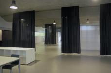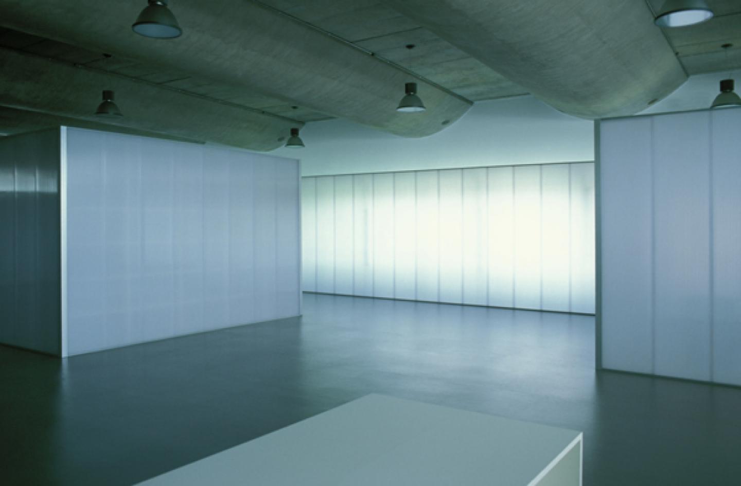 In a small residential area on the outskirts of Pistoia, the second floor of an industrial building was converted into an exhibition and work place for a small business that sells kitchenware. The plan foresees the realization of a company showroom with space for temporary displays and an events room, closely situated to the offices and work space. The idea of a single area was chosen to allow the spaces to be enlarged with wide-reaching effects and the creation of multiple levels of interaction and communication between those spaces. The linear and elementary plan has a neutral character, with structures inside the structure, and is capable of creating a dynamic succession of spaces. It is a great hall organized with sliding walls/curtains that allow a quick transformation to display area, events room, conference room and places to work. The furnishings are multi-functional and either become display surfaces or assume a more active function. Offices and meeting rooms, developed as more refined spaces, are immersed in the large rectangular space that measures 18 x 30 meters: 540 square meters of utilizable surface that is flexibly divisible. An important part of the project concept was the realization of an open central communication zone distributed toward the various functional parts of the program. Semi-transparent boxes for meetings and open work zones allow for rapid and relaxed scientific exchange. Some parts of the space, pauses between the container and the contained volumes, are instead peaceful places for concentration. They are small rest stops in the dynamic of the internal fluxes in the course. The internal casing is made up of satiny polycarbonate panes in neutral hues; this gives the skin the ability to transmit variable tones of brightness and a particular three-dimensional effect. The polycarbonate opal glass panes create a dematerialized casing: the light reflected on the materials and objects gives the walls a look in continuous elegant metamorphosis. The semi-transparent polycarbonate membrane, illuminated from the inside at night, emanates changing tones and transparencies. The meeting spaces are inserted in an open exhibition landscape of walls here and there modulated by different reflections of light: rectangular volumes with semi-transparent walls come one after another inside the perimeteric skin laid on the preexisting structure. They seem to fluctuate on the horizontal cement elements on the ceiling. The semi-transparency of the curtains filters the direct light from outside creating an ethereal effect. The artificial lighting is composed of hanging aluminum lights while it is possible to recreate a regular diffusion of natural light in the profundity of the space through the modulation of the polycarbonate. On the inside, the satiny panels block the view toward the outside and avoid glares by dissolving the natural light. Thin openings in the semi-transparent inner wall of the boxes allow for fleeting perspective views through the casing toward the movement outside. The glass panels, like views of the modular system in polycarbonate panes, held in aluminum runners, harden the frame. The combination of materials creates an atmosphere of serene tranquility in harmony with the products displayed. The spaces are equipped with an electric heating system by thermal radiation in the floor and a cooling system through mechanical vaporization and ventilation. Behind the semi-transparent panes in the technical halls there are white fluorescent tubes that are turned on with a timer. The welcoming and stimulating interior atmosphere is created with few materials and colors: from the pure opal glass walls to the gray linoleum flooring and from the cement surfaces of the ceilings to the neutral whites of the furnishings. It is a project of conversion and increasing the density of the space, a “factory of ideas” with the particular appeal of industrial spaces in the air.