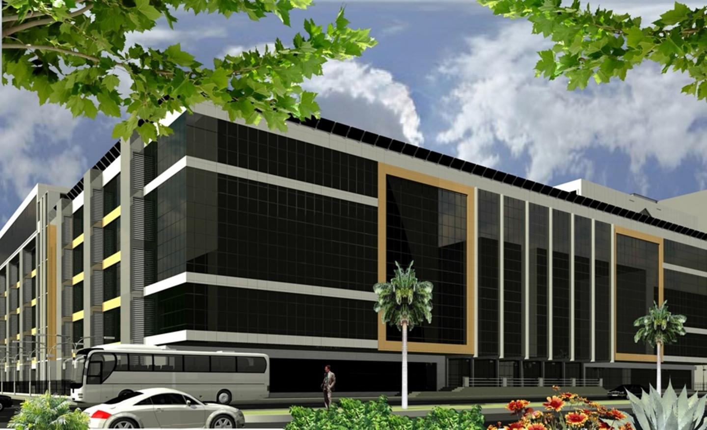 frame structure with double-level sub-terranean car park; elevated to 7 storeys; includes 240 shops on 5 storeys and 12 penthouses on 2 storeys with eco-friendly amenity outdoor lighting; uv resistant window glazing; building integrated photovoltaic panels as energy backup; plot size is 92metres x 92 metres; Total floor area +50,000sqm