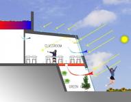 The greenhouses, below the South facing classrooms, capture solar radiation that is converted into heat. This heat is directed into the classrooms through vents that can be closed during Summer time.