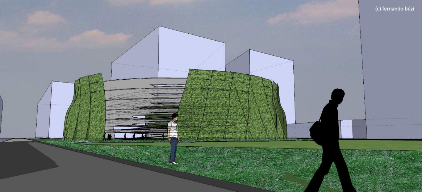 It started as a study on an hypothetical multipurpose car park silo which would combine parking, garden and also an exhibition and leisure area at its core. I stopped at this Sketchup/Photoshop render.