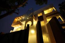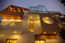 Designed as a flexible compound for overnight guests, the guest house maximizes volume, light and privacy on a 500 square meters urban corner plot. The building has been designed as an art of modernism with the use of colours and shade. The architect himself has taken this building as a canvas that needed to be painted, polished and coloured. The beauty of the building has been enhanced by the use of multiple grooved panels painted in different shades in the front elevation. The panels seen to be like a puzzle blocks but uniquely arranged to create this abstract pattern which just seem to merge within the structure itself. To add more to the canvas the architect introduces an abstract steel frame shaped structure which act as a sunshade elements and it continues to form a part of the railing at bottom .The boundary wall has multiple fins with textured glass in between and on either side being painted in green pastel shade with wooden battens being run in abstract fashion. A stainless steel frame with glass shades the granite counter at the rear. The Buddha statue with the building background symbolizes connectivity between the past and present.