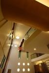 As one enter the building a person is led to a double height lobby and the feeling of openness engulf a person fully. The entrance lobby has this abstract shape reception table with curved wooden partition at the rear creating screen to the room at the back. The waiting area has interesting artwork (designed by architect) in form of multiple panels which extends on double height wall.