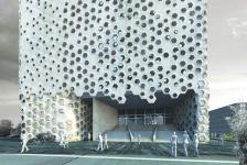 TO CREATE PRIVACY TO THE SCHOOL SPACES AND MAKE THE BUILDING MORE ENERGY EFFICIENT A SECOND SKIN OF HEXAGONAL MODULES SHEATHS THE ENTIRE BUILDING.