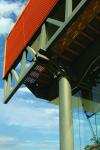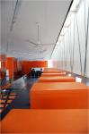 Although seasonally, but scorching heat and furious rains pose a major threat to the built fabrics in most parts of India. Our mission, therefore, has always been to find affordable and unconventional solutions to reduce operational cost. The umbrella, a timeless and an extremely economical device, inspired us to develop a shading system provided by corrugated cement sheets around steel frame construction for roof and elevation of the first floor. The glare of the sky is cut off by drawing this cladding very low, thus maintaining the views. Subsequently, loss of significant natural light has been compensated for by a linear skylight running all along the cantilevered building length. The exterior and interior tactile quality of the building appears to be robust and powerful during the day as the sunrays strike the undulating orange surface.