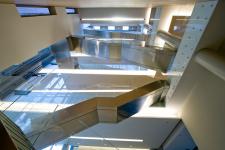 The heating system uses the residue from machining carried out by the companies in the group; tele-heating is combined with condensation boilers. Cross-flow air treatment machines facilitate energy recovery and come with motors regulated by means of inverters (30% electricity saving). The two water coolers have desuperheaters for condensation temperature recovery to dehumidify the rooms. Solar panels provide hot water. Air is let into the rooms through the floor along the façades, with inlets in the counter ceilings.
