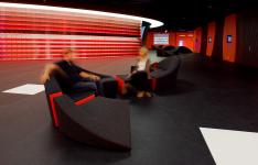 In contrast with the conference and session rooms, which are designed in white and aluminium, the foyer is designed in dark intense colours, black, red and orange. The choice of materials and colours is based on the theme “fire and ice”. To intensify the experience of the space, materials were chosen which look hard but feel soft. The walls are clad in orange skai leather. The floor has a black rubber finish.