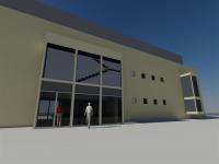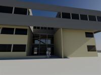 This is a building of laboratories, technology and computer rooms. The public areas, the foyer and the staircases, are well lit through glass walls shaped like cubes bursting through the front wall.