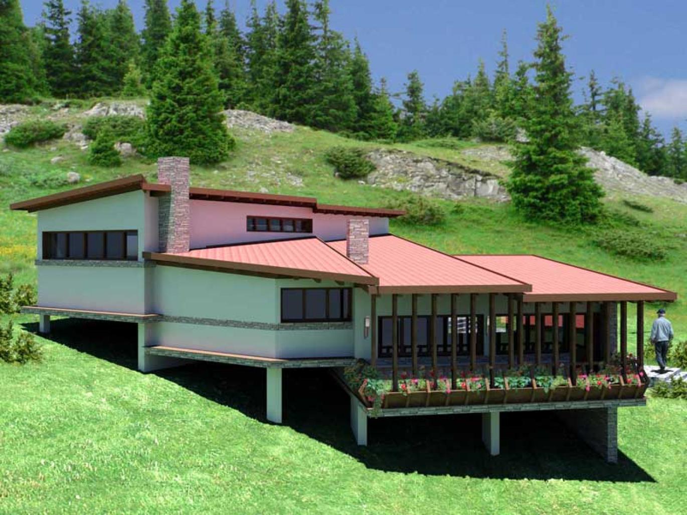 Largest displacement of the terrain, geological features and groundwater emerging in rainfall, the design of the buildings have three levels and lift them above ground. On the first level are three bedrooms, each with separate bathroom, toilet, second floor - entrance, kitchen-dining room, storage room and toilet on the third level is the living room.