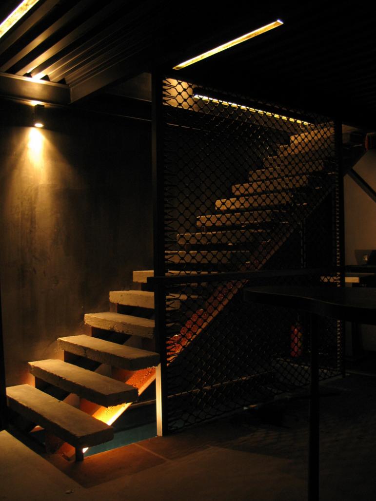 The stairway was set at the back of the space, consisting of two orange metallic elements with concrete steps, shaping it’s schematic section perpendicularly to the space, back of the protective roll that was used instead of a railing.