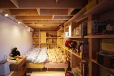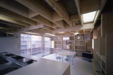 Wire sheet glass, steel sheet, laminated plywood, thermal insulation, PB, wood, and FRP are used in appropriate places conforming to legal restrictions. Vertical load is supported by 2×8 and 2×12 timber. Positioning of plywood are determined so that bearing walls would also function as back boards of shelves. Timber and plywood will be factory-assembled into panels in order to reduce transportation and construction costs.