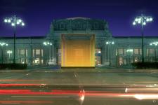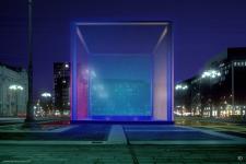 `A Light Sign` located in front of the main entrance of Milano Centrale railway station: a large cubic steel frame holding a thin net sprinkled with vaporized water and illuminate by lights of a different color on each side. The Pirelli Tower, in 1999 Milan`s tallest building, stands on the background of the image visualizing the green colored face of the cube.