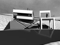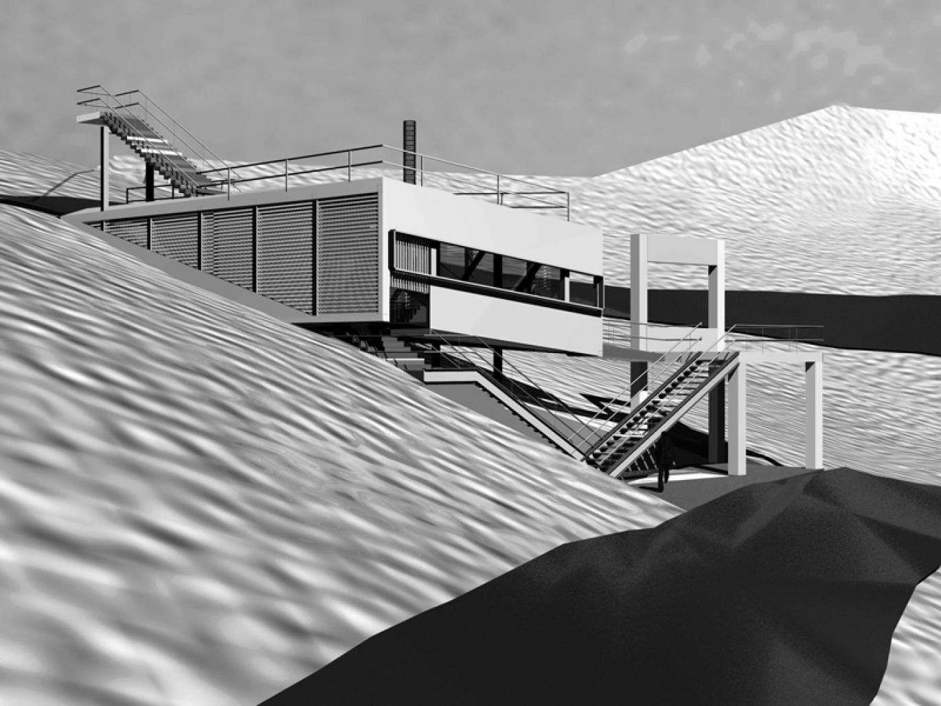 THE VILLA IS ON TOP OF A HILL OUTSIDE A VILLAGE 50 KM. FROM TEHRAN (THE CAPITAL CITY) (ALTITUDE OF 2800 M). THE AREA OF THE SITE IS 300 M^2 OF WHICH ONLY 80 M^2 COULD BE BUILT ON ACCORDING TO LOCAL REGULATIONS. THE GENERAL FORM IS RECTANG¬ULAR SOLID WHICH IS DEFORMED ON ONLY SIDE.