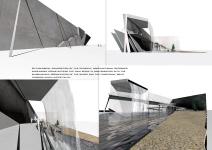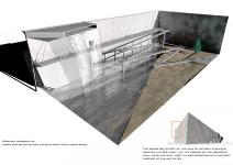 Mythological composition of the stairway, nonfunctional deformed cube-based forms outside the main space in conversation with the diagrammatic organization of the ramps & the functional solid through which water falls.