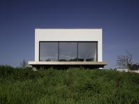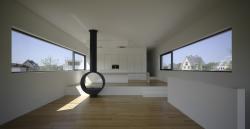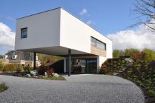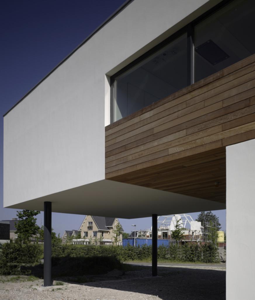 This house partly rests on an existing hill. The overhang of the house functions as a canopy for the entrance. The living area is connected to the garden with a terrace on the hill.