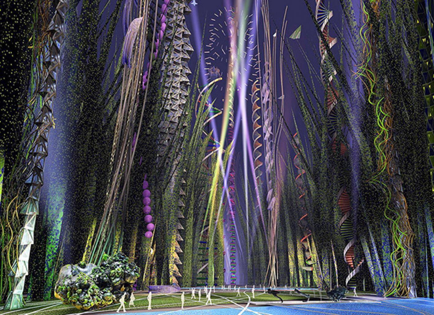 The space between houses is completely given to pedestrians, there are placed objects of modern art, sculpture, museums, art galleries, holographic cinema, exhibitions of innovations in the development of plants and animals and much more. Climate in the bottom watered by the activity of plants-houses, gardens and parks are located at the top - on the roof.