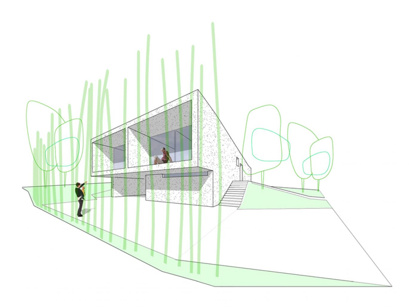 The design has thus taken the shape of a “bridge-house” gently laid on the ground.