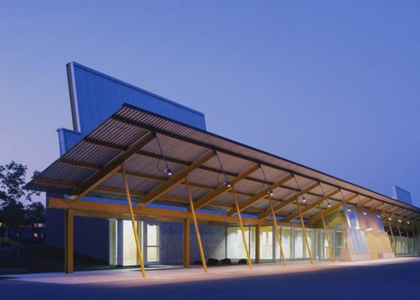 The building is organized linearly along the street to reinforce a precinct of public buildings with the nearby school. A steel canopy runs the length of the building, providing protected outdoor areas at the entries, and defining areas for outdoor activities to occur.