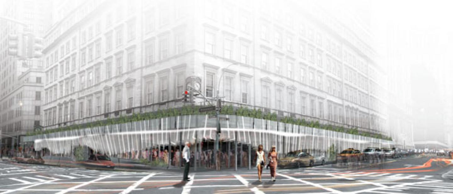 The ‘3788468 urbanSHED’ experience utilizes a safe and straightforward system of RHS steel frames as ‘portals’ to be arranged according to the proportions of each particular building site. Within this system, a continuous series of lasercut blades, made from recycled plastic sheets are aligned to create an organic and playful spatial experience, one that encourages and facilitates a variety of New York City street experiences to occur spontaneously. At 280 Broadway a reading of the existing building site has informed the design of the shed pathway to include breakout spaces as an extension of the existing storefront businesses for dance, cafes, informal markets, food kiosks and transportation nodes (“taxi hailing” and bus stops). Planters establish a green edge to both the soffit line and the seating areas, creating green gathering spaces.