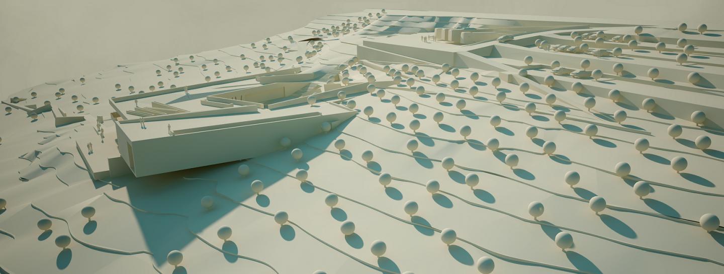 We installed the reception and exhibition buildings in pure geometric volumes embedded particularly in the reliefs with green roofs.